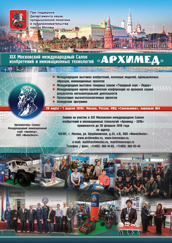 С 29 марта по 1 апреля 2016 года в Москве, в павильоне № 4 Конгрессно-выставочного центра «Сокольники», будет проходить XIX Московский международный Салон изобретений и инновационных технологий «Архимед-2016» (далее – Салон).
