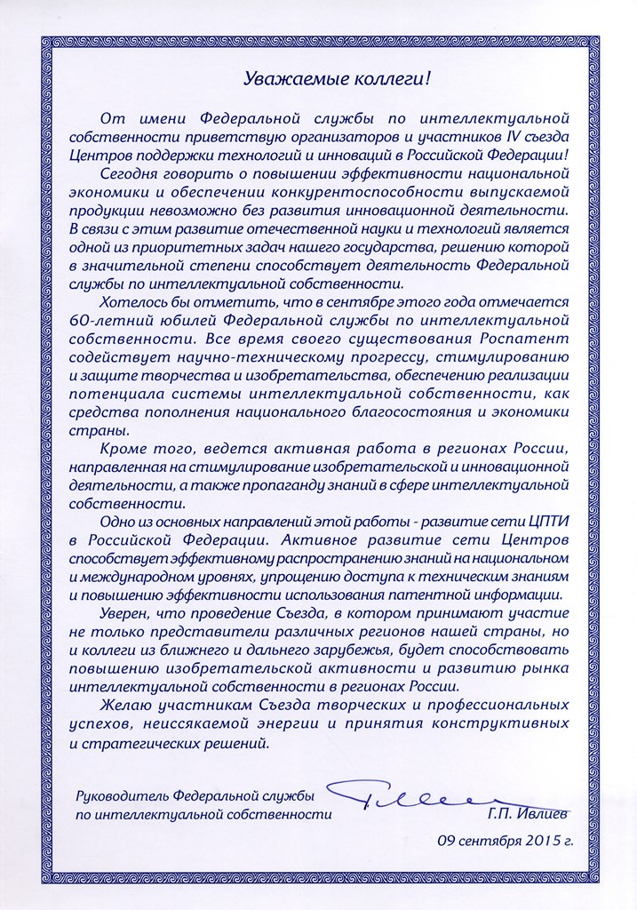 9-10 сентября 2015 г. в г. Чебоксары в Национальной библиотеке Чувашской Республики прошел IV съезд Центров поддержки технологий и инноваций в Российской Федерации, приуроченный к 60-летию Федеральной службы по интеллектуальной собственности.