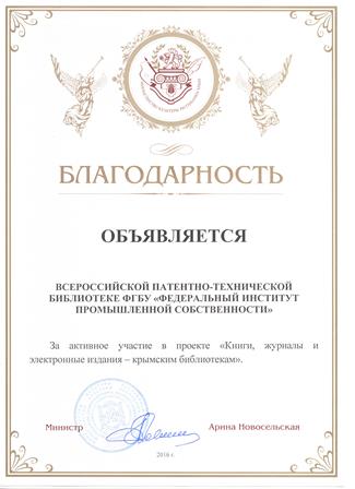Коллективу ВПТБ в лице Ольги Бахваловой, заведующей отделением ВПТБ ФИПС, от имени Министра культуры Республики Крым Арины Новосельской вручили благодарность за активное участие в проекте «Книги, журналы и электронные издания – крымским библиотекам». Напомним, что ВПТБ ФИПС выступила одним из спонсоров проекта форума «Книги, журналы и электронные издания – крымским библиотекам», в рамках которого преподнесла в дар более 400 вместо 200 запланированных ранее книжных изданий научно-технической, медицинской тематики, а также юридическую литературу, в том числе по вопросам правовой охраны интеллектуальной собственности.
