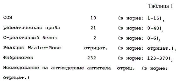 К концу четвертого месяца лечения полностью исчезла припухлость суставов, и больная не жаловалась ни на боли в суставах, ни на их тугоподвижность по утрам. Лабораторные показатели приведены в табл. 1.