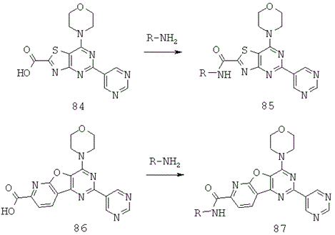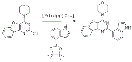 Газообразным аргоном продували смесь 2-хлор-4-морфолинобензофуро[3,2-d]пиримидина (ASA75) (80 мг, 0,276 ммоль, 1,0 экв.) и пинаколинового эфира индол-4-бороновой кислоты (ММ 243) (267 мг, 1,10 ммоль, 4,0 экв.) в 1,2-диметоксиэтане и 2М Na2CO3 (3:1) (6 мл) в течение 5 минут. Добавляли комплекс дихлор 1,1'-бис(дифенилфосфино)ферроцен-палладия(II) и дихлорметана (ММ 732) (5,05 мг, 0,00690 ммоль, 0,025 экв.) и реакционную смесь кипятили с обратным холодильником (90°С) в течение 15 часов 30 минут, охлаждали и разбавляли EtOAc (20 мл). Органический раствор промывали смесью H2O:Na2CO3:NH4OH (конц., 32% раствор в воде)=5:4:1 (9 мл), затем NH4Cl (нас.) и солевым раствором (2×), сушили Na2CO3, фильтровали и концентрировали. Очистка при помощи хроматографии па силикагеле (градиент от 100% гексана в EtOAc до 50% гексана) позволила получить желтоватое твердое вещество (89,0 мг, 87%).
