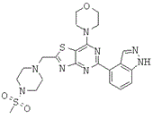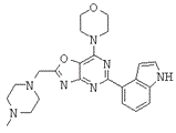 Класс PI3K-связанных белков, называемый PI3K IV класса, состоит из высокомолекулярных ферментов с каталитическим ядром, аналогичным PI3K и PI4K, и включает мишень рапамицина (mTOR, также называемую FRAP), ДНК-зависимую протеинкиназу (ДНК-ПК), мутировавший генный продукт атаксии-телангиэктазии (ATM), атаксию, связанную с телеангиэкстазией (ATR), SMG-1 и трансформационный/транскрипционный ассоциированный с доменом белок (TRRAP). Первые пять представителей являются активными белковыми серин-треонинкиназами, которые участвуют в контроле роста клеток и контроле генома/транскриптома [Marone et al., Biochimica et Biophysica Acta 1784:159-185 (2008)]. ДНК-ПК, ATM, ATR и SMG-1 участвуют в ответе на повреждение ДНК. Единственной активной киназой, не участвующей в повреждении ДНК, является mTOR, которая регулируется факторами роста и доступностью питательных веществ и координирует синтез белка, рост и пролиферацию клеток. Мишень рапамицина (mTOR) образует комплекс 1 и интегрирует сигнал фактора роста (посредством PI3K7PKB и каскад Ras/MAPK), энергетический статус (LKB1 и АМРК) и детектирование питательных веществ. TOR позитивно регулируется PKB/Akt, которая фосфорилирует негативный регулятор TSC2 в комплексе туберозного склероза (TSC), что приводит к активации GТРазы Rheb и mTOR [Marone et al., Biochimica et Biophysica Acta 1784:159-185 (2008)]. В то же время, mTOR стимулирует трансляцию рибосомных белков и, следовательно, биогенез рибосом посредством активации p70S6K [Wullschleger et al., Cell 124:471 (2006)]. Рапамицин и его производные RAD001 и CCI-779 связываются с FKBP12 и очень селективно блокируют активность комплекса mTOR 1 (mTORC1). С применением рапамицина и его производных проводили множество клинических испытаний, в основном на пациентах с опухолью, характеризующейся усиленной передачей сигнала PI3K и гиперактивной mTOR. Многообещающие результаты были получены для лимфомы из клеток зоны мантии, рака эндометрия и почечно-клеточной карциномы [Guertin et al., Cancer Cell 12:9 (2007)]. Рапамицин и его производные сохраняют анти-ангиогенную активность, так как они нейтрализуют действие VEGF [Guba et al., Nat. Med. 8:128 (2002)], что открывает возможность для лечения, комбинированного с традиционной химиотерапией [Beuvink et al.), Cell 120:747 (2005)].
