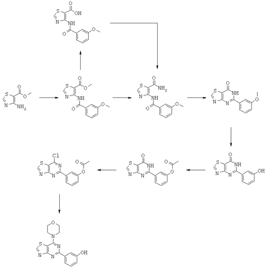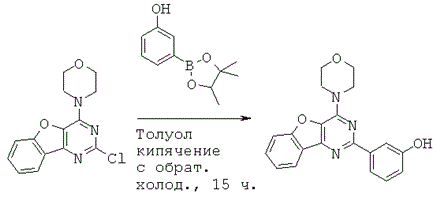 Газообразным аргоном продували смесь 2-хлор-4-морфолинобензофуро[3,2-d]пиримидина (ASA66) (48,7 мг, 168 µмоль, 1,0 экв.) и пинаколинового эфира 3-гидроксифепилбороновой кислоты (ММ 220) (148 мг, 672 µмоль, 4,0 экв.) в 1,2-диметоксиэтане и 2М Na2CO3 (3:1) (4 мл) в течение 5 минут. Добавляли комплекс дихлор 1,1'-бис(дифенилфосфино)ферроцен-палладия(II) и дихлорметана (ММ 732) (3,07 мг, 4,20 µмоль, 0,025 экв.) и реакционную смесь кипятили с обратным холодильником (90°С) в течение 15,5 часов. Раствор красного цвета охлаждали и разбавляли EtOAc (6,5 мл). Органический раствор промывали смесью H2O:Na2CO3:NH4OH (конц., 32% раствор в воде)=5:4:1 (6,5 мл), затем NH4Cl (нас.) и солевым раствором (2×), сушили Na2CO3, фильтровали и концентрировали. Очистка при помощи хроматографии на силикагеле позволила получить бесцветное твердое вещество (49 мг, 85%).