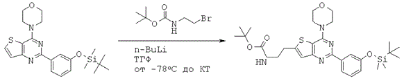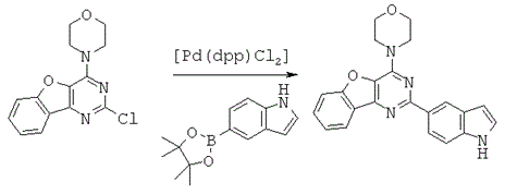 Газообразным аргоном продували смесь 2-хлор-4-морфолинобензофуро[3,2-d]пиримидина (ASA75) (80 мг, 0,276 ммоль, 1,0 экв.) и пинаколинового эфира индол-5-бороновой кислоты (ММ 243) (267 мг, 1,10 ммоль, 4,0 экв.) в 1,2-диметоксиэтане и 2М Na2CO3 (3:1) (6 мл) в течение 5 минут. Добавляли комплекс дихлор 1,1'-бис(дифенилфосфино)ферроцен-палладия(II) и дихлорметана (ММ 732) (5.05 мг, 0,00690 ммоль, 0,025 экв.) и реакционную смесь кипятили с обратным холодильником (90°С) в течение 15 часов, охлаждали и разбавляли EtOAc (20 мл). Органический раствор промывали смесью H2O:Na2CO3:NH4OH (конц., 32% раствор в воде)=5:4:1 (9 мл), затем NH4Cl (нас.) и солевым раствором (2×), осушили Na2CO3, фильтровали и концентрировали. Очистка при помощи хроматографии на силикагеле (градиент от 100% гексана в EtOAc до 70% гексана) позволила получить бесцветное твердое вещество (35 мг, 34%).