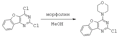 2,4-Дихлорбензофуро[3,2-d]пиримидин (61 мг, 0,255 ммоль, 1,0 экв.) растворяли в МеОН (2 мл) и добавляли морфолин (49,1 мл, 562 µмоль, 2,2 экв.) Реакционную смесь кипятили с обратным холодильником в течение 30 минут, затем охлаждали до комнатной температуры. Удаляли растворители в вакууме и очищали остаток при помощи хроматографии на силикагеле (градиент от 100% гексана в EtOAc до 50% гексана) с получением бесцветного твердого вещества (59,4 мг, 80%).