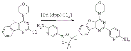 Газообразным аргоном продували смесь 2-хлор-4-морфолинобензофуро[3,2-d]пиримидина (ASA75) (80 мг, 0,276 ммоль, 1,0 экв.) и пинаколинового эфира 2-аминопиридин-5-бороновой кислоты (ММ 220) (243 мг, 1,10 ммоль, 4,0 экв.) в 1,2-диметоксиэтане и 2М Na2CO3 (3:1) (6 мл) в течение 5 минут. Добавляли комплекс дихлор 1,1'-бис(дифенилфосфино)ферроцен-палладия(II) и дихлорметана (ММ 732) (5,05 мг, 0,00690 ммоль, 0,025 экв.) и реакционную смесь кипятили с обратным холодильником (90°С) в течение 14 часов 45 минут, охлаждали и разбавляли EtOAc (9 мл). Органический раствор промывали смесью H2O:Na2CO3:NH4OH (конц., 32% раствор в воде)=5:4:1 (9 мл), затем NH4Cl (нас.) и солевым раствором (2×), сушили Na2CO3, фильтровали и концентрировали. Очистка при помощи хроматографии на силикагеле (градиент от = % MeOH в ДХМ до 5% MeOH в ДХМ) позволила получить бесцветное твердое вещество (4,40 мг, 5%).