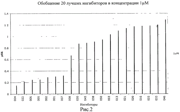 Клетки помещали в 96-луночные планшеты (Packard) за 24 часа до начала эксперимента. К среде добавляли ингибитор или ДМСО в качестве контрольного образца (каждый образец в двух экземплярах) и инкубировали в течение 3 часов. Для фиксации клетки обрабатывали 4% пара-формальдегидом в течение 20 минут. После промывания ФСБ/0,1% Triton/X-100, проводили заливку 100% козьей сыворотки в ФСБ в течение 1 часа. Растворенные в ФСБ антитела против рРКВ Ser473 (Cell Signalling) и РКВ (получены в дар от Э.Хирша (Е.Hirsch)) или pS6 Ser235/236 (Cell Signalling) инкубировали во встряхивателе в течение ночи при 4°С. После промывания ФСБ применяли вторичные антитела (LI-COR), разбавленные ФСБ, при комнатной температуре в темноте. Планшеты промывали ФСБ перед сканированием на устройстве для чтения планшетов Odyssey.