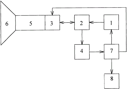 Выход детектора 4 подключен к низкочастотному (НЧ) блоку измерения и управления 7. Этот блок представляет собой вычислительное устройство на базе микропроцессора с постоянным и оперативным запоминающими устройствами и внешним интерфейсом ввода - вывода. Управляющие выходы НЧ-блока 7 подключены к управляющим входам СВЧ- генератора 1 и полупроводникового выключателя 3, а информационный выход - к жидкокристаллическому индикатору 8. Работой всех элементов устройства управляет микропроцессор по программе, заложенной в его память. Измерение модуля коэффициента радиопоглощения