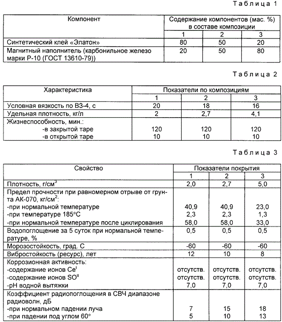 Согласно изобретению радиопоглощающий материал состоит из двух компонентов: полимерного связующего на основе латекса и магнитного наполнителя. В качестве полимерного связующего использован синтетический клей "Элатон", представляющий собой водоэмульсионную композицию на основе синтетического латекса, загустителя и антисептика (ТУ 2385-002-11165336-95). Это универсальный клей, предназначенный для склеивания различных материалов (дерева, металлов, керамики и др.), представляет собой нетоксичную густую жидкость белого цвета без специфичного запаха. Клей модификации "Элатон-К" имеет следующие технические характеристики: