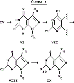 Соединение формулы IV, как определено ранее, реагирует с избытком мочевины при температуре кипения с образованием соединения формулы VI. Соединение формулы VII образуется по реакции соединения VI с хлорокисью фосфора или тионилхлоридом при температуре между примерно 70oC-140oC и удобно при температуре кипения реакционной смеси при необязательном присутствии основания, такого как N,N-диэтиланилин. Соединение формулы VIII образуется по реакции соединения VII с AH в тех же условиях реакции, как описано выше для реакции соединения II с AH.