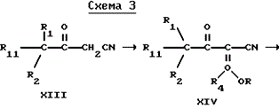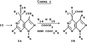 Соединения формулы I, где II является CR1R2R11 или C(=CR12R13)R2, могут быть получены, как описано ниже на схеме 2, из соответствующих соединений формулы II, где R4 и R5 имеют значения, определенные ранее, и R9 является R3, как указано для формулы I, реакцией с соединением формулы CHR1R14R15, где R1 имеет значения, определенные для формулы I, и R14 и R15 каждый независимо друг от друга означают COO(C1-C2алкил), CO(C1-C2) или CN с образованием соединения формулы IA. Реакцию проводят в присутствии основания, такого как гидрид натрия, C1-C5алкоголят калия, бис(триметилсилил)амид лития или натрия и диизопропиламид натрия или лития, в среде, инертного к реакции растворителя, такого как диметилсульфоксид, ацетонитрил, C2-C6алкил спирт или N-метил-пирролидон, предпочтительно диметилсульфоксид. Реакция предпочтительно выполняется при повышенных температурах примерно 100oC-110oC.