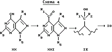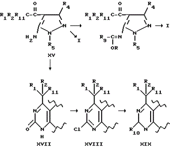 Как показано на схеме I, соединения формулы I, где R3 является группами, отличными от R9 (в будущем R10), могут быть получены реакцией соединения формулы I, где R3 представляет собой хлор, обозначенного на схеме I формулой VIII, с нуклеофилом формулы R10H с или без органического или неорганического основания. Пригодными основаниями являются натрий, гидрид натрия и гидроксид щелочного металла, такой как гидроксид калия, и слабые основания, такие как карбонат калия или триэтиламин. Последний обычно используют, когда R10H означает алканол, C1-C6алкантиол, амин, например NH(C1-C6алкил) или фторид тетрагидробутиламмония. Пригодными растворителями являются диметилсульфоксид, ацетонитрил, C1-C5алкилспирт тетрагидрофуран, бензол, толуол или хлористый метилен.