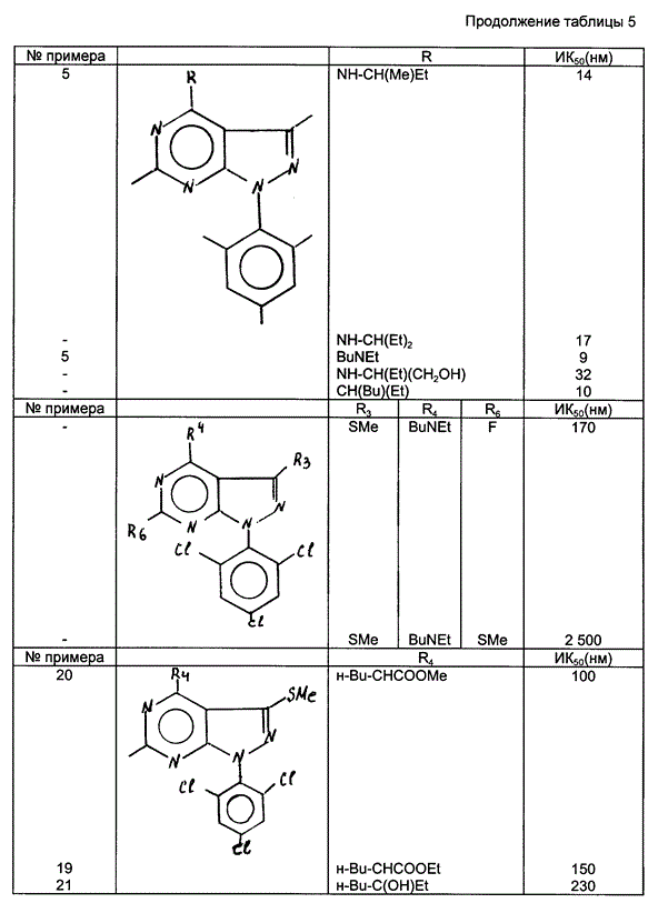7. Соединение по п.1, представляющее собой: 3-{(4-метилбензил)-[3,6-диметил-1-(2,4,6-триметилфенил)-IH-пиразоло[3,4-d] пиримидин-4-ил] -амино}-пропан-1-ол; диэтил-[6-метил-3-метилсульфанил-1-(2,4,6-трихлорфенил)-IH-пиразоло[3,4-d] пиримидин-4-ил]-амин; 2-{бутил-[6-метил-3-метилсульфанил-1-(2,4,6-трихлорфенил)-IH-пиразоло[3,4-d] пиримидин-4-ил] -амино} -этанол; дибутил-[6-метил-3-метилсульфанил-1-(2,4,6-трихлорфенил)-IH-пиразоло[3,4-d]пиримидин-4-ил] -амин; бутил-этил-[6-метил-3-метилсульфанил-1-(2,4,6-трихлорфенил)-IH-пиразоло[3,4-d] пиримидин-4-ил] -амин; бутил-этил-[6-метил-3-метилсульфанил-1-(2,4,6-трихлорфенил)-IH-пиразоло[3,4-d] пиримидин-4-ил]-амин; бутил-циклопропилметил-[6-метил-3-метилсульфанил-1-(2,4,6-трихлорфенил)-IH-пиразоло[3,4-d] пиримидин-4-ил] -амин; ди-1-пропил[6-метил-3-метилсульфанил-1-(2,4,6-трихлорфенил)-IH-пиразоло[3,4-d] пиримидин-4-ил] -амин; диаллил-[6-метил-3-метилсульфанил-1-(2,4,6-трихлорфенил)-IH-пиразоло[3,4-d]пиримидин-4-ил] -амин; бутил-этил-[6-хлор-3-метилсульфанил-1-(2,4,6-трихлорфенил)-IH-пиразоло[3,4-d] пиримидин-4-ил] -амин; бутил-этил-[6-метокси-3-метилсульфанил-1-(2,4,6-трихлорфенил)-IH-пиразоло[3,4-d] пиримидин-4-ил]-амин; пропил-этил-[3,6-диметил-1-(2,4,6-триметилфенил)-IH-пиразоло [3.4-d]пиримидин-4-ил] -амин; и 4-(1-этилпропил)-6-метил-3-метилсульфанил-1-(2,4,6-триметилфенил)-IH-пиразоло[3.4-d]пиридимин.