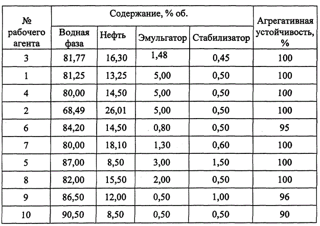 Свойства (количественные характеристики составов и агрегативная устойчивость) рабочих агентов для вытеснения вязкой нефти на основе водонефтяной эмульсии приведены в таблице.