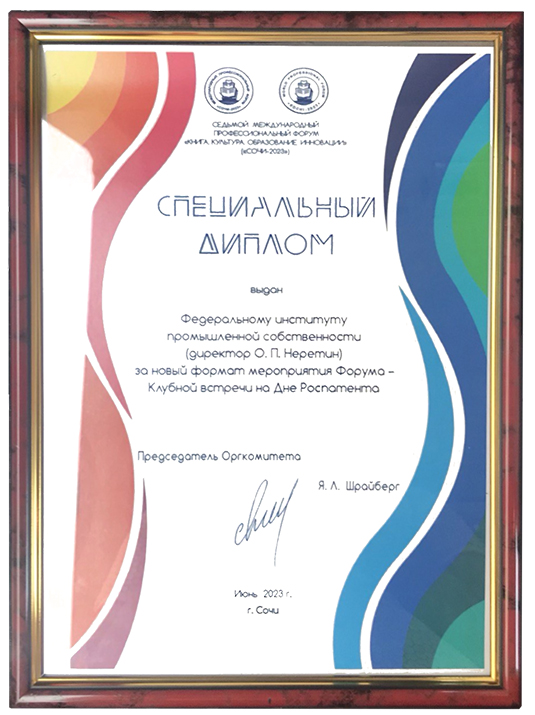 По итогам работы ФИПС был отмечен Специальным дипломом Седьмого международного профессионального форума «Книга. Культура. Образование. Инновации» (Судак-Сочи-Транзит, «Сочи-2023») за новый формат мероприятий Форума – Клубная встреча в рамках Дня Роспатента.