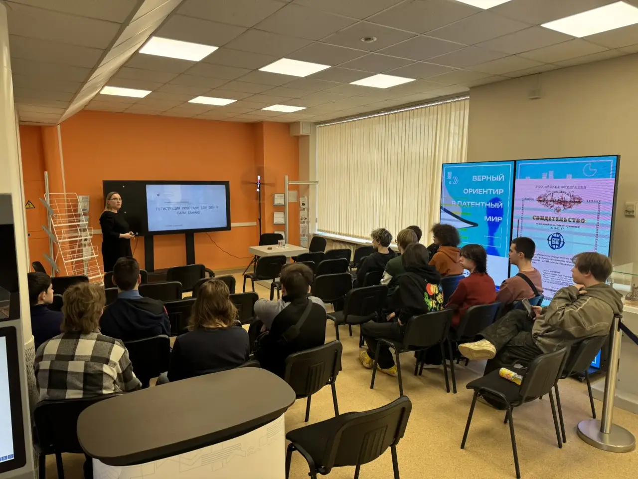 В Зале электронных ресурсов для участников провели практический интенсив. Студенты узнали о патентной информации как об уникальном источнике научно-технических знаний, познакомились со структурой патентных документов и освоили азы работы с Информационно-поисковой системой ФИПС (ИПС ФИПС). Они научились находить документы по ключевым словам, номерам документов и фамилиям изобретателей.