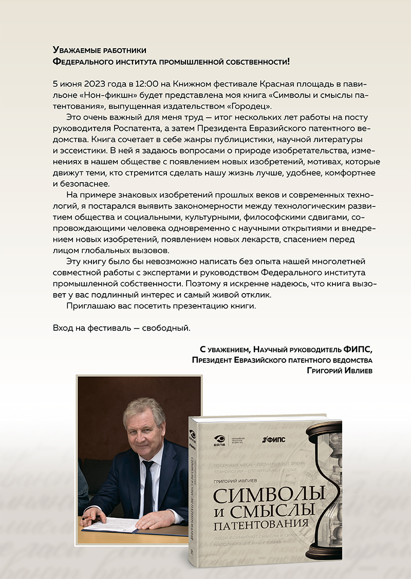 5 июня 2023 года в шатре «Нон-фикшен» на Книжном Фестивале Красная площадь пройдет презентация новой книги Президента Евразийского патентного ведомства (ЕАПВ) Григория Ивлиева. Начало презентации в 12:00. Вход на фестиваль — свободный.