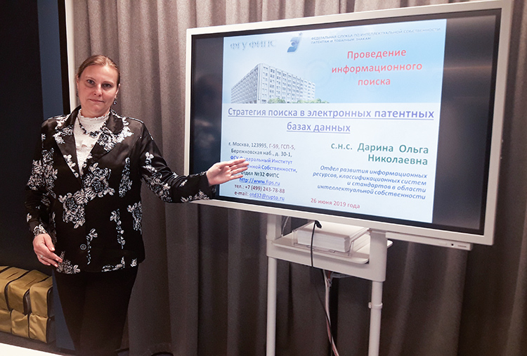 Спикерами выступили: руководитель Научно-образовательного центра ФИПС Денис Монастырский, заведующая отделом неорганических и полимерных соединений Наталия Пономарева и старший научный сотрудник отдела развития информационных ресурсов, классификационных систем и стандартов в области интеллектуальной собственности Ольга Дарина.
