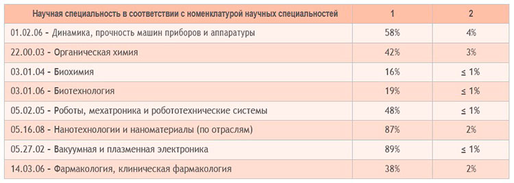 В основу источникового исследования был положен метод выборочного информационного поиска по типологическому, временному и тематическому признаку. Объектом исследования выступили диссертации по определенным научным специальностям, объявления о защите которых в 2017–2019 гг. размещены на сайте Высшей аттестационной комиссии [3]. На основе сплошного просмотра выбранных документов (электронных ресурсов) методами контентного анализа, в том числе анализа библиографических данных, выявлена, во-первых, доля диссертаций, результаты которых запатентованы (1), во-вторых, доля диссертаций, по которым патенты представлены в качестве эквивалента публикации результатов в рецензируемых научных журналах, включенных в перечень ВАК (2) (См. Табл. 1).