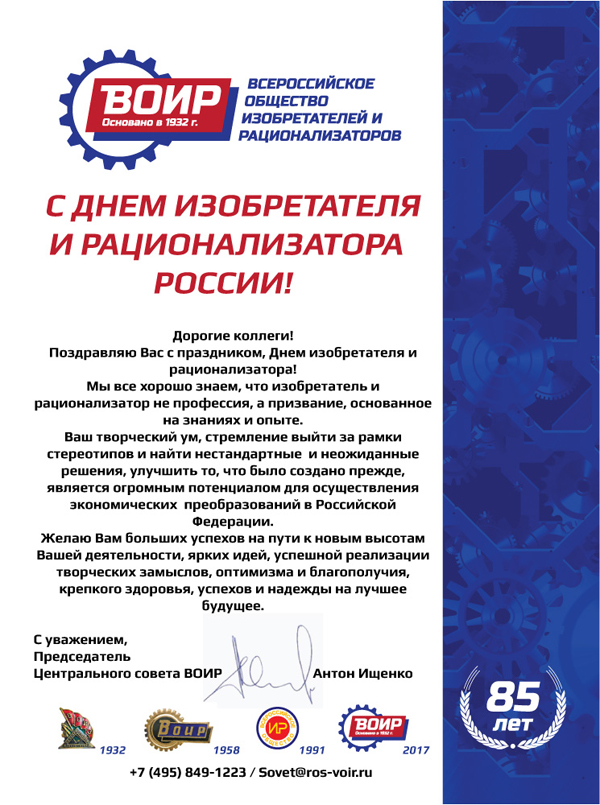 Поздравление Председателя Центрального Совета ВОИР Антона Ищенко с Днем изобретателя и рационализатора