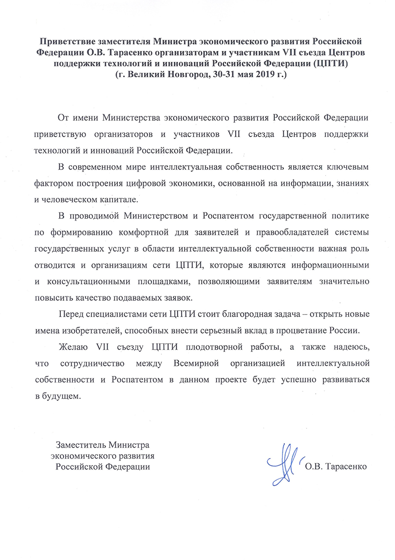 Приветствие заместителя Министра экономического развития Российской Федерации О.В. Тарасенко организаторам и участникам VII съезда Центров поддержки технологий и инноваций Российской Федерации (ЦПТИ)