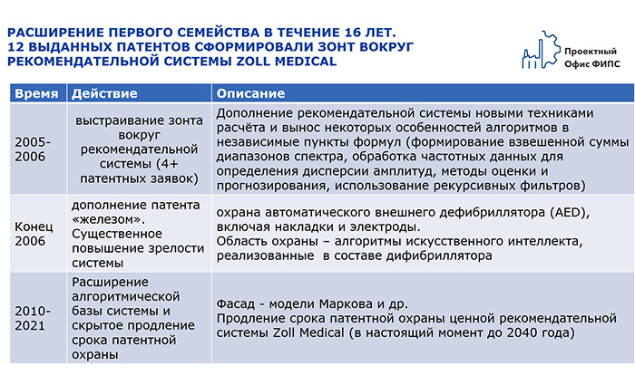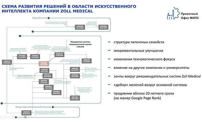 Далее, анализируя усложнение и комплексирование алгоритмов и программного обеспечения посредством прямого патентного цитирования от «первого» патента, восстанавливается генезис технологий искусственного интеллекта Zoll Medical. На каждом новом витке прямого патентного цитирования выполняется усовершенствование интеллектуальных систем Zoll Medical.