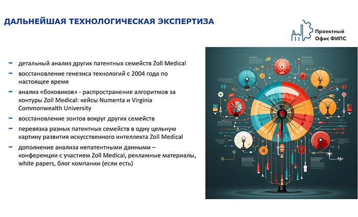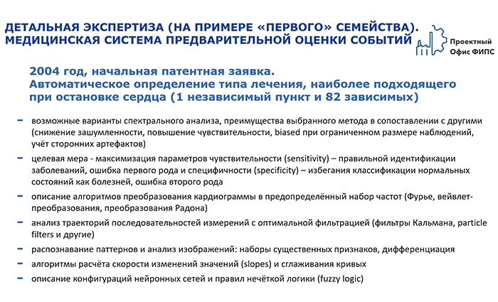 Далее каждое из патентных семейств, составляющих генезис технологий, исследуется с привлечением специалистов, имеющих компетенции как в области прикладной математики, науки о данных (data science) и искусственного интеллекта, так и в области проектирования и реализации современных архитектур информационных систем. Исключение данного этапа, задействование вместо профессиональных ИТ-экспертов других специалистов, не обладающих практическим опытом проектирования и реализации сложных систем интеллектуального анализа данных, не позволит восстановить генезис конкретных технологий Zoll Medical.