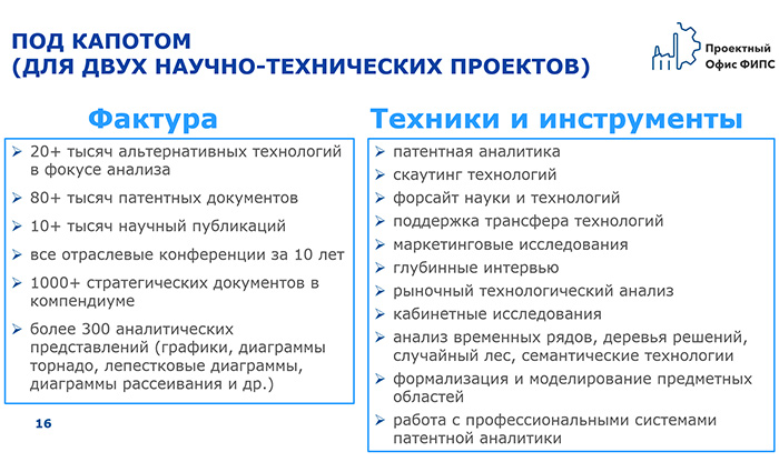 В рамках пилотного сопровождения для двух проектов было проанализировано более 20 тысяч альтернативных технологий, более 10 тысяч научных публикаций и все отраслевые конференции за последние 10 лет.