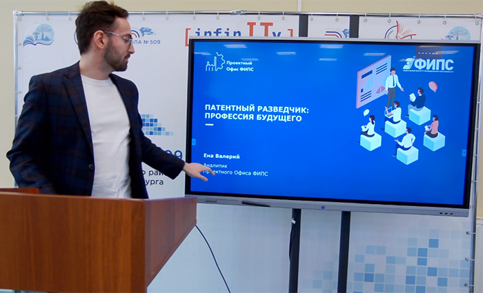 В рамках дней интеллектуальной собственности Валерий Ена, патентный аналитик Проектного Офиса Федерального института промышленной собственности, выступил с открытой лекцией для учеников социально-экономических классов Санкт-Петербурга.