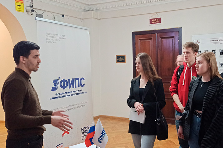 Сибирский центр ФИПС представили государственные эксперты по интеллектуальной собственности II категории отдела полезных моделей (09) Александр Милютин и Игорь Кояков, главный специалист сектора дополнительного профессионального образования (125) Алёна Самотой. Они рассказали студентам о деятельности института и работе государственных экспертов по интеллектуальной собственности, перспективах трудоустройства и преимуществах работы в ФИПС.