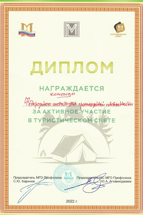 22-24 июля 2022 года под девизом «Za МИР!» состоялся юбилейный пятый Открытый молодежный туристический слёт, организованный МГО Профсоюза работников госучреждений и Молодёжным Союзом. Мероприятие прошло под Звенигородом. Специалисты ФИПС приняли участие в слёте в составе сборной команды «Братство Z».
