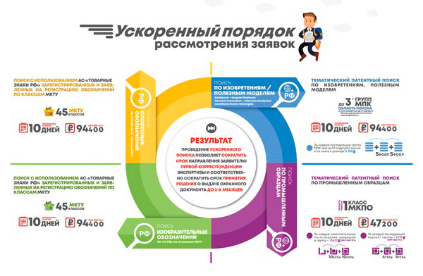 Услуга ускоренного порядка рассмотрения заявок значительно упрощает процедуру регистрации товарных знаков и выдачи патентов. Именно благодаря ей срок принятия решения о выдаче охранного документа сократился до двух месяцев. В разное время этот срок составлял от 18,5 до 6 месяцев.